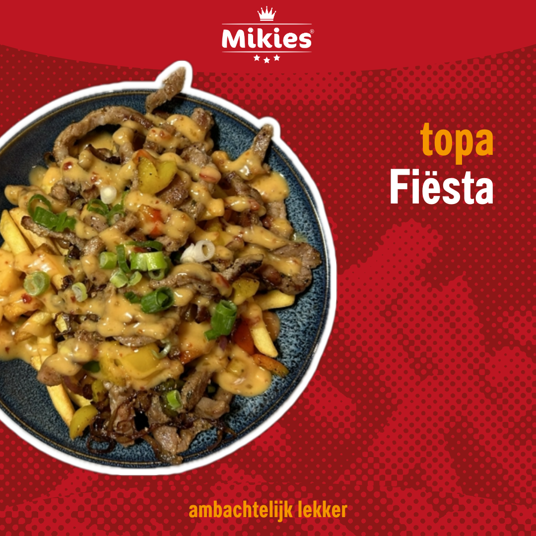 Vanaf 2 juli kun je onze nieuwe topa proberen! Deze topa Fiësta is een waar feestje op je bord; gekruide vleesreepjes met gebakken uien en paprika en afgegarneerd met Fiësta-saus. Pas je op dat je je vingers er niet bij opeet?