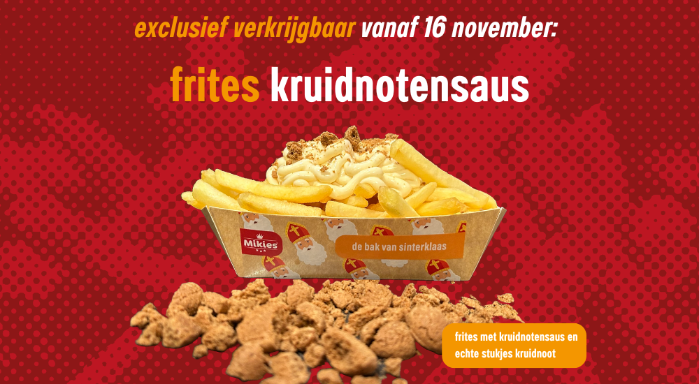 Boxtel / Haaren – Vanaf 16 november exclusief verkrijgbaar bij onze winkels in Boxtel en Haaren: frites kruidnotensaus met échte stukjes kruidnoot. ”Ik hoor je denken: is dat wel lekker? Nou proef het maar gewoon even. Het is even wennen, maar grappig is het wel”, geeft Joey (23, mede-eigenaar bij Mikies) aan.